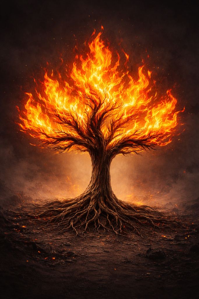 At the center of all nine realms lies Coeurîle, an island that once held the most powerful and sacred symbol in all of Emarion: the Everflame Tree. Mortals believed that the Everflame was the source of Life and Death. Its massive, gnarled form stretched to the clouds, with branches made of fire and roots buried deep into the Sacred Sea. It was not just a tree, but a living force that represented balance, creation, and the connection between life and death.